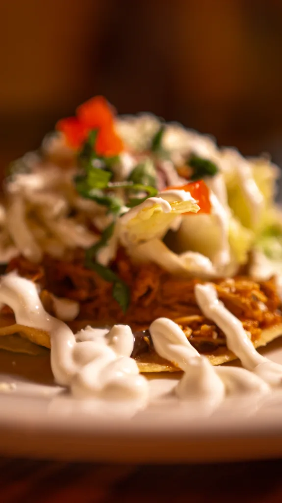 Fried until golden, rigid and crispy corn tortilla with refried beans, Chuluhua cheese, crema, lettuce and pico de gallo. Choice of Beef Barbacoa, Chicken Tinga, Pork Carnitas, Chimichurri seasoned grilled or blackened chicken, Ground Beef, Mexican Chorizo or seasonal veggies